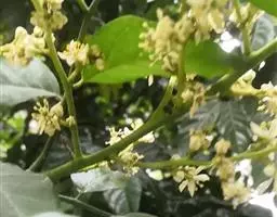 圆锥花序腋生及顶生,通常3—5厘米,很少较短,但顶生的长可达14厘米;花序轴、花梗及萼片常被早脱落的褐锈色微柔毛;萼裂片卵形,端钝,宽约1毫米;花瓣白色,长约4毫米,长椭圆形,较迟脱落,干后变淡褐色,边缘淡黄色;雄蕊10枚,极少8枚,花丝略不等长,上部宽阔,下部稍狭窄,与花药接连处突尖,药隔顶端有1油点;子房阔卵形至圆球形,油点不凸起,花柱极短,柱头稍增粗,子房柄略升起。