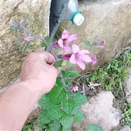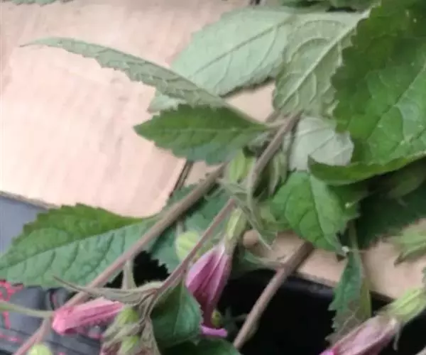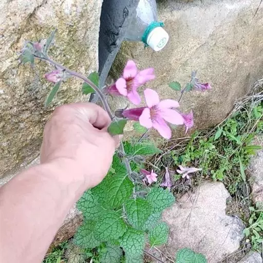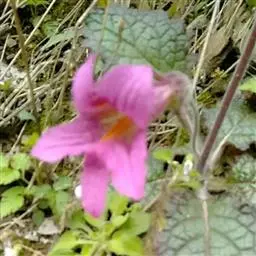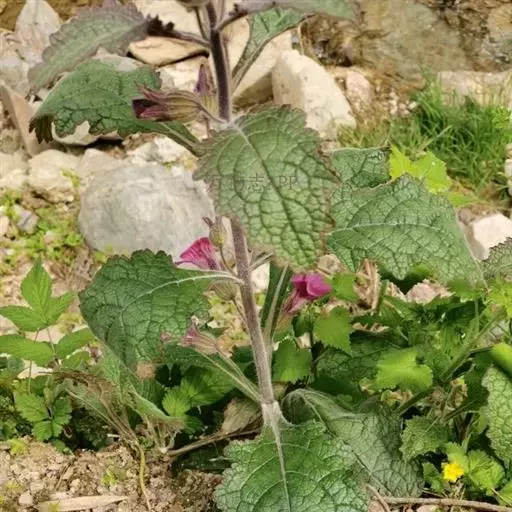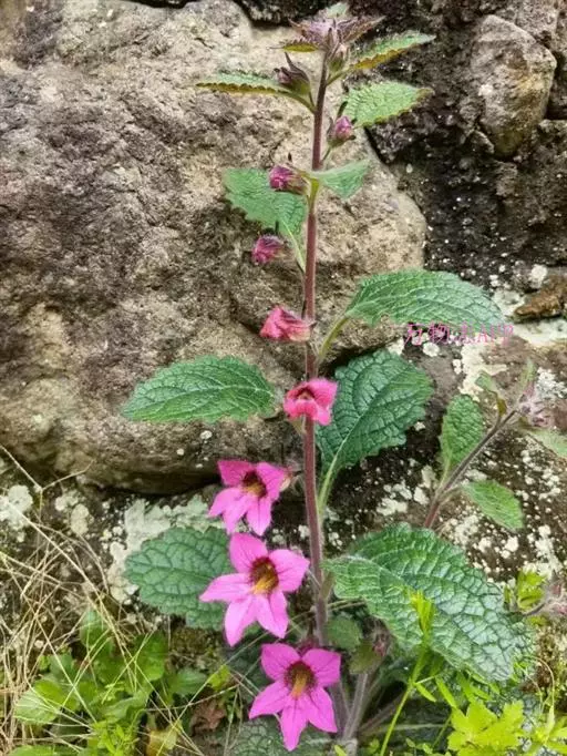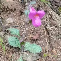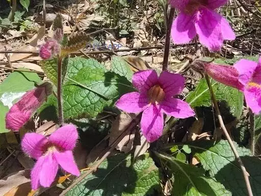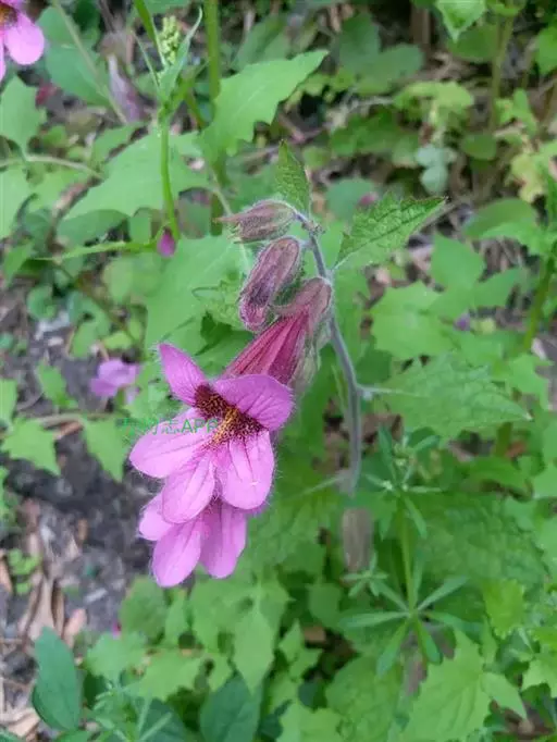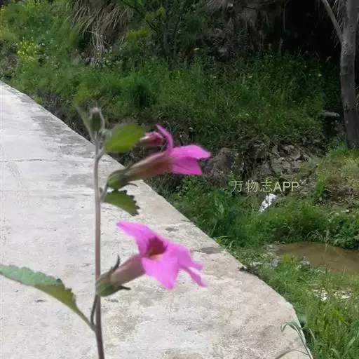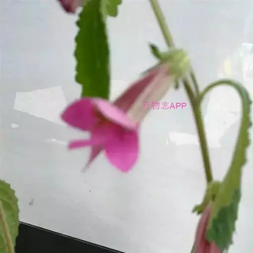 花单生,连同花梗总长超过苞片;花梗长1-4厘米,多少弯曲而后上升,与萼同被多细胞长柔毛及腺毛;萼长1-2厘米;萼齿披针形或卵状披针形,先端略尖;后方3枚稍长,中间的1枚长1-1.2厘米,两侧的长0.5-0.8厘米;前方2枚长0.3-0.7厘米,彼此近于相等;花冠紫红色,长5.5-7厘米,外面被多细胞长柔毛;上唇裂片长卵形,先端略尖或钝圆,长1.4-1.8厘米;下唇裂片长椭圆形,先端尖或钝圆,中裂片长约2厘米,宽1.4厘米,侧裂片稍小;雄蕊后方一对稍短,其花丝基部被短腺毛,前方一对稍长,其花丝无毛;药室矩圆形,长约1.5毫米,基部叉开成一直线;花柱顶端扩大,先端尖或钝圆。蒴果卵形,长约1.4厘米,具宿存的花萼及花柱。种子多数,卵形至长卵形,长约1.1毫米,具网眼。花期4-5月,果期5-6月。