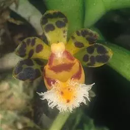 大花盆距兰(学名:Gastrochilus bellinus (Rchb. f.) Kuntze):茎粗壮,长2-5厘米,节间长约1厘米。叶大,带状或长圆形。伞形花序侧生,通常2-3个,具4-6朵花;花大;萼片和花瓣淡黄色带棕紫色斑点,椭圆形,近相似,长12-17毫米,宽6-7毫米,先端圆钝;花瓣比萼片稍小;前唇白色带少数紫色斑点,近肾状三角形,通常多少下弯,长7-10毫米,宽1.5-2厘米,边缘啮蚀状或流苏状,上面除中央的黄色垫状物外密布白色乳突状毛。花期4月。