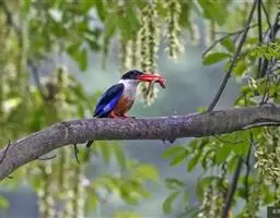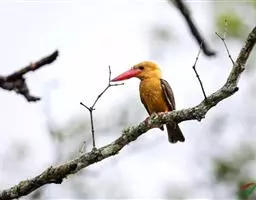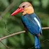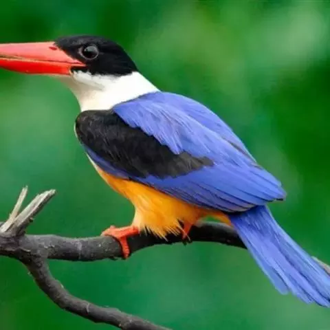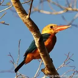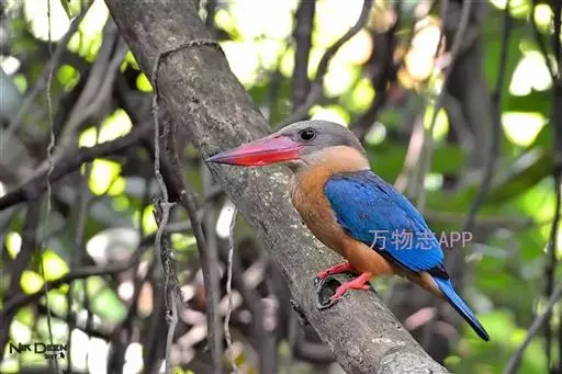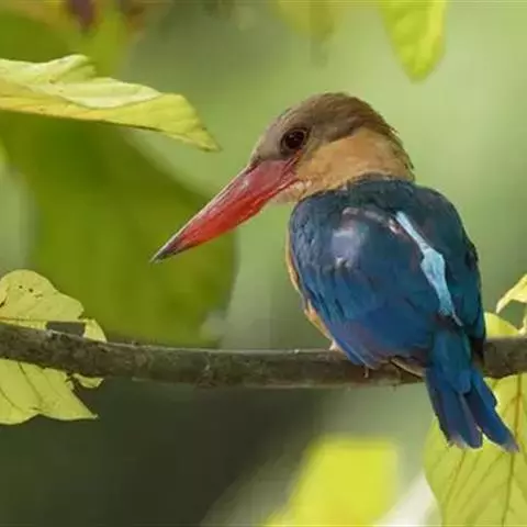 鹳嘴翡翠(学名:Pelargopsis capensis):体长33-37厘米。体重140-200克。共有13个亚种,体型大,嘴形巨大、侧扁,似鹳嘴,红色,嘴峰两侧有鼻沟。头灰褐色,上体蓝色,下体和宽阔的领环赭土色,脚红色。飞翔时翅上无斑。