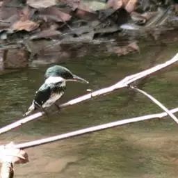 绿鱼狗是佛法僧目翠鸟科的鸟类。成年雄鸟,额头和眼先是黑色,头顶端深绿色呈古铜光泽。翅膀羽毛有白色斑…