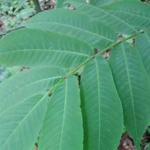 奇数羽状复叶生于萌发条上者长可达80厘米,叶柄长9-14厘米,小叶15-23枚,长6-17厘米,宽2-7厘米;生于孕性枝上者集生于枝端,长达40-50厘米,叶柄长5-9厘米,基部膨大,叶柄及叶轴被有短柔毛或星芒状毛;小叶9-17枚,椭圆形至长椭圆形或卵状椭圆形至长椭圆状披针形,边缘具细锯齿,上面初被有稀疏短柔毛,后来除中脉外其余无毛,深绿色,下面色淡,被贴伏的短柔毛及星芒状毛;侧生小叶对生,无柄,先端渐尖,基部歪斜,截形至近于心脏形;顶生小叶基部楔形。