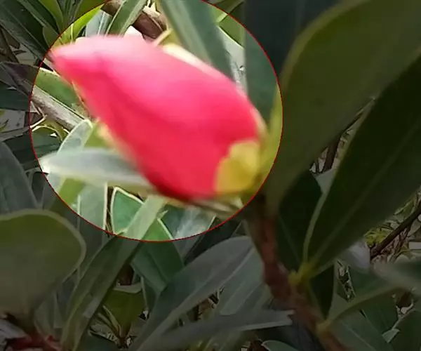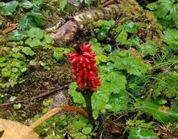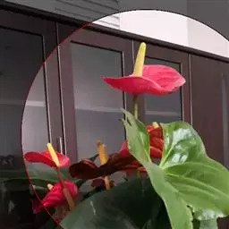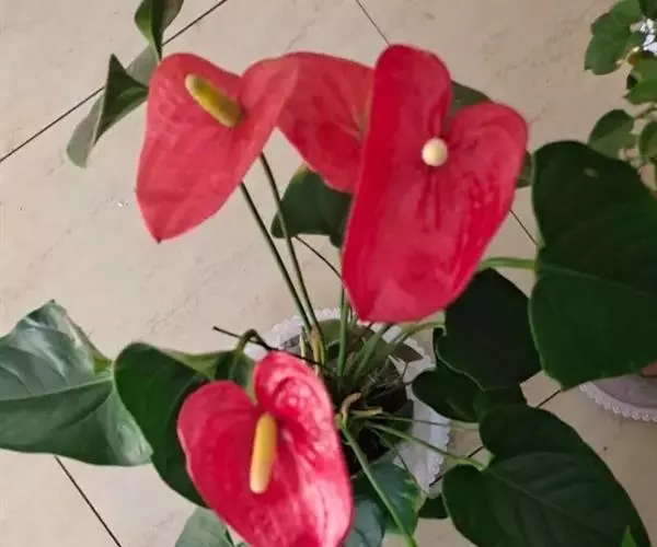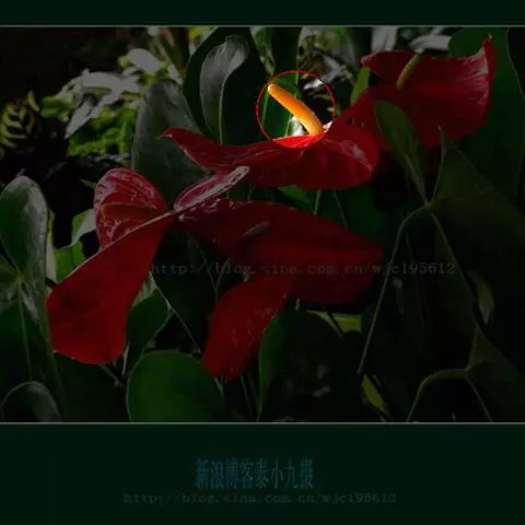 佛焰苞平出,卵心形,革质并有蜡质光泽,橙红色或猩红色;肉穗花序长5-7厘米,黄色,可常年开花不断。