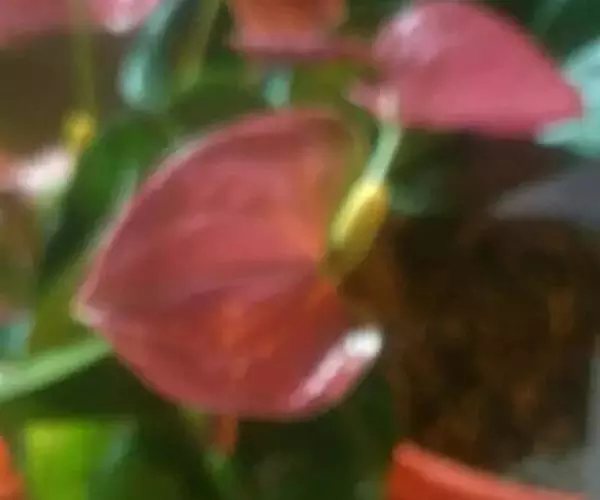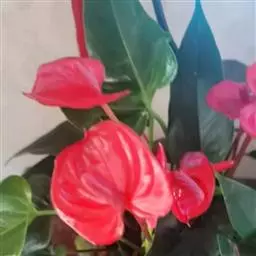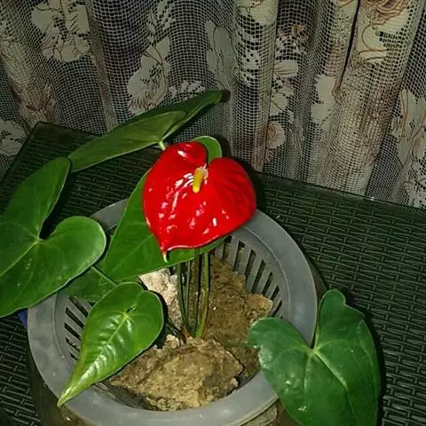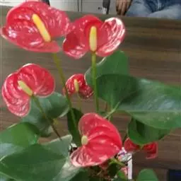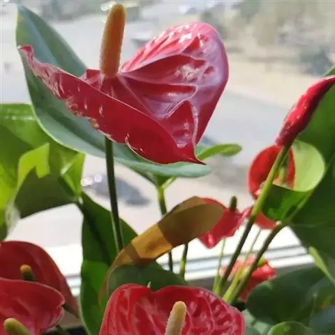 花烛(Anthurium andraeanum Linden):是单子叶植物纲天南星科花烛属多年生常绿草本植物。茎节短;叶自基部生出,绿色,革质,全缘,长圆状心形或卵心形。叶柄细长,佛焰苞平出,革质并有蜡质光泽,橙红色或猩红色;肉穗花序黄色,可常年开花不断。
