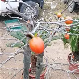 大秋 原产日本,国家资源圃于1997年从日本直接引进。该品种果实特大,平均重230克,最大果重368克,高馒头形,橙红色。果肉黄色均一,无褐斑。肉质酥脆,口感甜爽,汁多味浓,糖度达24%,品质极上。是日本近年育成的少有的大果、优质完全甜柿品种。有极高的商品性。在陕西省10月上中旬成熟。但必须强调,由于该品种属于富有系品种,引入中国后,与软枣亲和力极差,高接时应接在大柿树上,而不要接在软枣上;育苗时也必须接于本砧或以柿品种为中间砧的苗木上。另外,如成熟较早的完全甜柿品种伊豆、新秋;中熟品种前川次郎、兴津20;晚熟品种晚御所、骏河以及中国原产的罗田甜柿、秋焰、甜宝盖等甜柿品种在一定小气候下也可栽培生产。