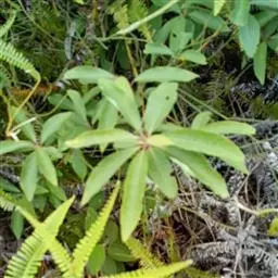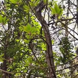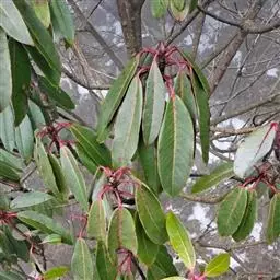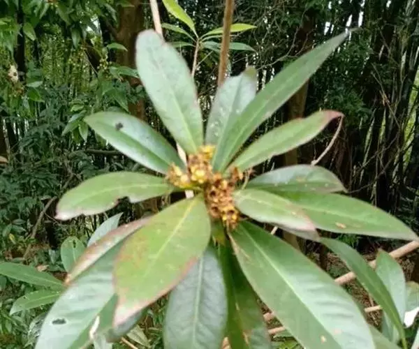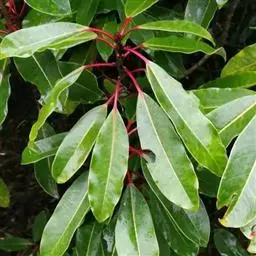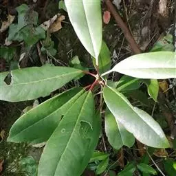 交让木(学名:Daphniphyllum macropodum Miq.)是虎皮楠科,虎皮楠属灌木或小乔木,高可达10米;小枝粗壮,暗褐色,叶革质,叶片长圆形至倒披针形,叶面具光泽,叶背淡绿色,无乳突体,侧脉纤细而密,叶柄紫红色,粗壮,雄花、雌花花萼不育;花丝短,子房卵形,花柱极短,柱头外弯,扩展。果椭圆形,暗褐色,果梗纤细。3-5月开花,8-10月结果。