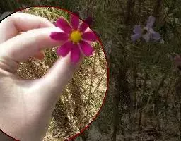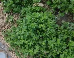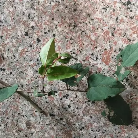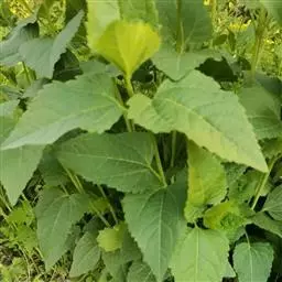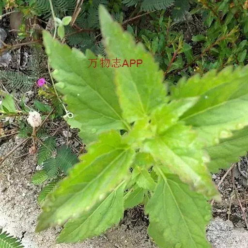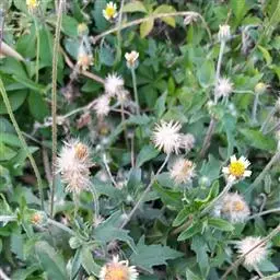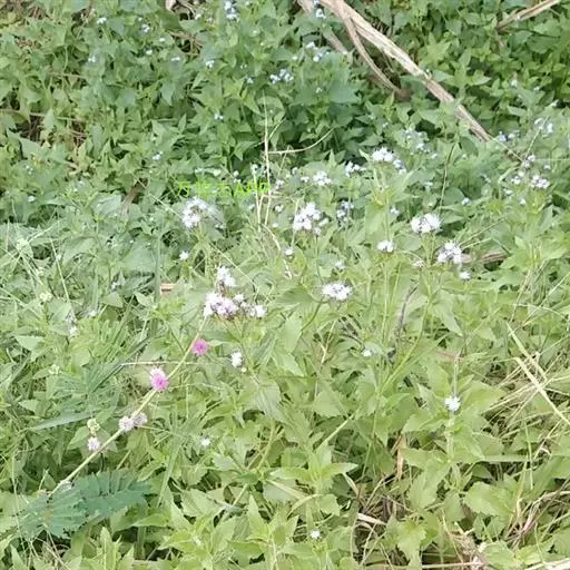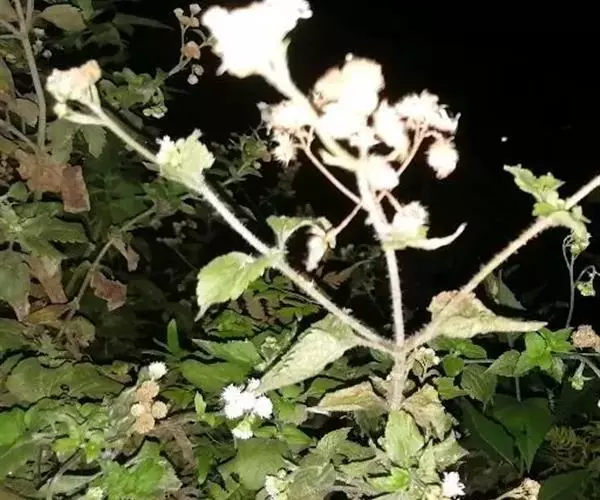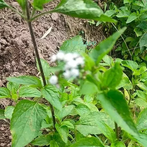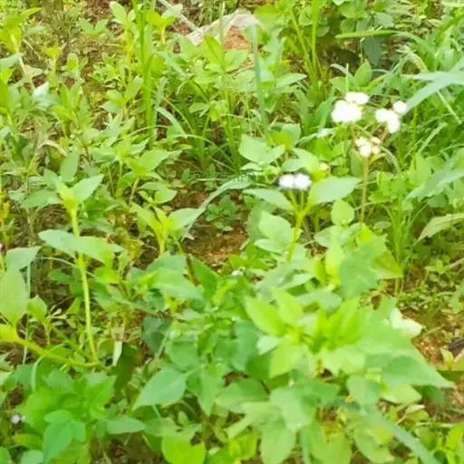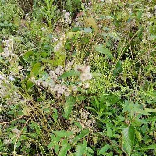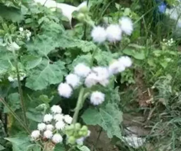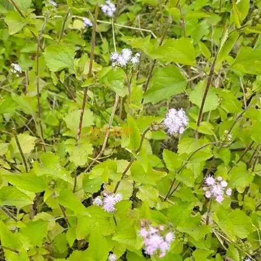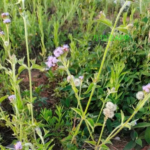藿香蓟(学名:Ageratum conyzoides L.):一年生草本,高50-100厘米,有时又不足10厘米。无明显主根。茎粗壮,基部径4毫米,不分枝或自基部或自中部以上分枝。全部茎枝淡红色,或上部绿色,被白色尘状短柔毛或上部被稠密开展的长绒毛。叶对生,有时上部互生,卵形或长圆形,有时植株全部叶小形,基出三脉或不明显五出脉。头状花序4-18个在茎顶排成通常紧密的伞房状花序,总苞钟状或半球形,宽5毫米。总苞片2层,长圆形或披针状长圆形。花冠长1.5-2.5毫米,外面无毛或顶端有尘状微柔毛,檐部5裂,淡紫色。瘦果黑褐色,5棱。花果期全年。