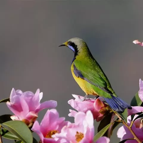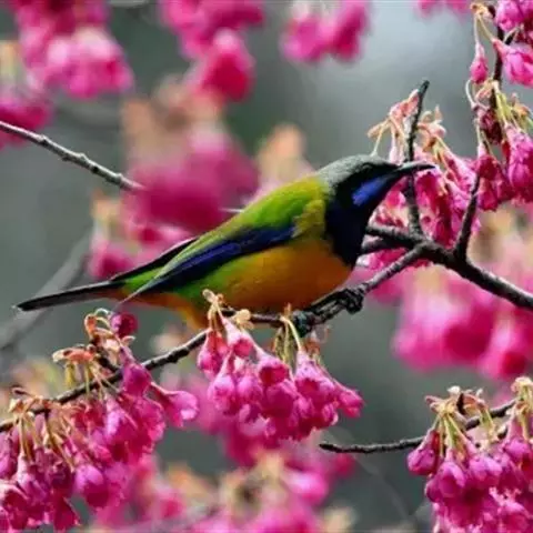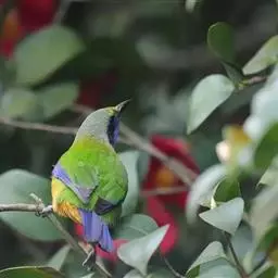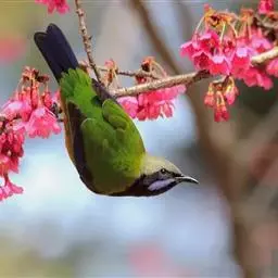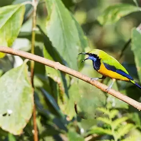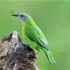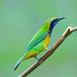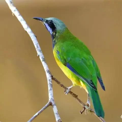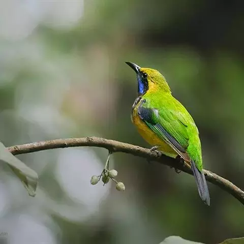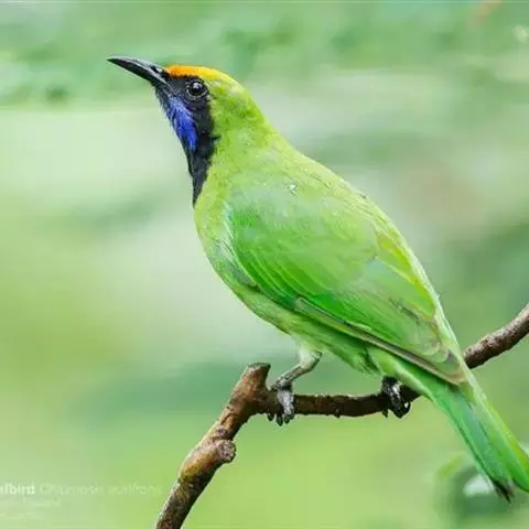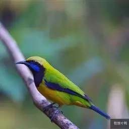 蓝翅叶鹎:小型鸟类,体长15-18厘米。雄鸟通体草绿色,尾蓝绿色,肩和翅亮蓝 色,胸缀有黄色,…