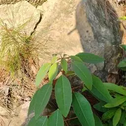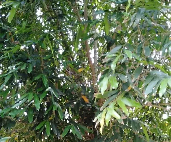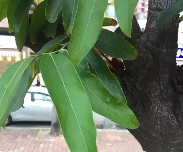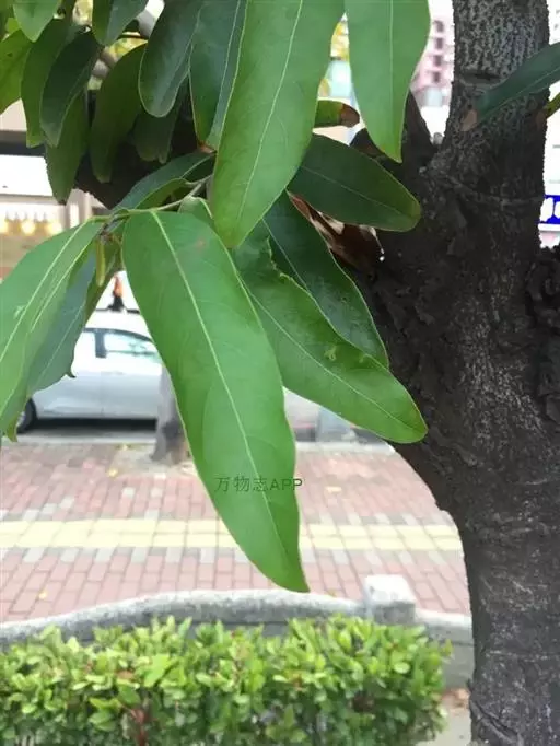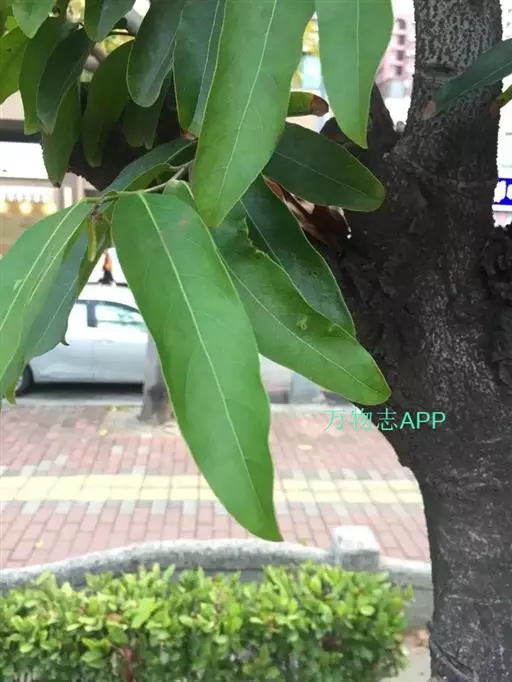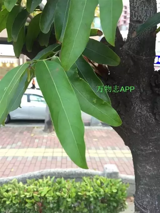 常绿大乔木,高7-20(-30)米;树干通直,树皮灰褐色;小枝粗壮,节部稍膨大。叶薄革质,卵状披针形或卵状长圆形,长10-30厘米,宽3-8厘米,先端长渐尖,基部通常圆形,稀宽楔形,偏斜,边全缘,无毛,上面绿色,下面淡绿色,干后赤褐色,侧脉8-10对,网脉细密,明显;叶柄长1.2-1.5厘米,无毛。