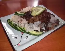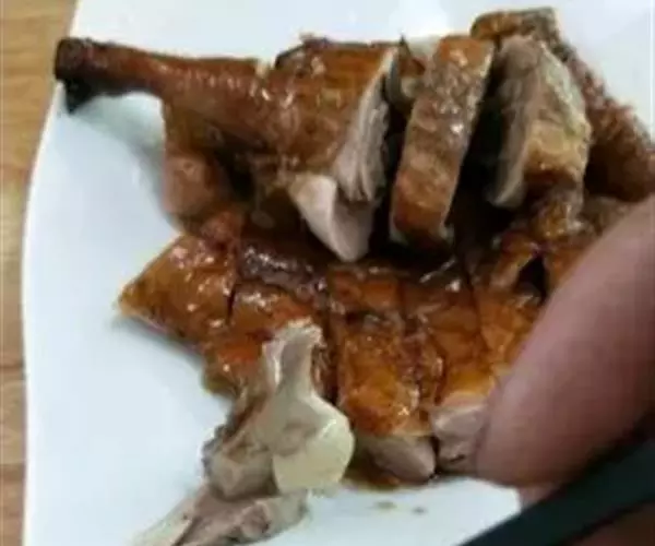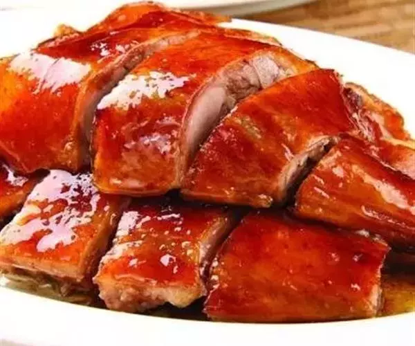 6、将晾干的鹅挂入烤炉中,用果木木炭烧中火慢烤,烤至鹅肉熟透时,改用大火将鹅的表皮烤至酥脆,取出,先倒出鹅腹内的卤汁,将鹅斩件装盘,再淋上卤汁,随酸梅酱味碟上桌蘸食即可。