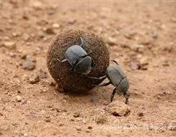 它们先像厨师制作肉丸子那样,用自己的前脚将粪便团成小球,然后用强壮的后腿将球滚到相对松软、更适合挖掘的地面。每只蜣螂都会挖掘交错的隧道,将两三个粪球推进去,再将土填回去。
