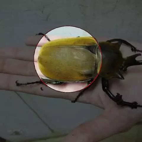雌虫外形与雄虫有较大区别。主要表现为头部中央无角状突,后面平,前面呈扁圆形隆起,顶端呈一横脊;前胸背板横形隆脊近似直线,两侧端部呈齿状角突,且只有外侧深凹明显可见。