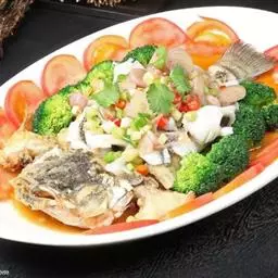 清蒸翡翠石斑鱼 石斑鱼中以青石斑鱼蛋白含量最高,比大黄鱼的蛋白含量都高,其次是棕点石斑鱼,珍珠龙胆石斑鱼和点带石斑鱼,七带石斑鱼和赤点石斑鱼的蛋白含量与中国花鲈、大菱鲆相近,而鞍带石斑鱼和美洲黑石斑鱼与真鲷的蛋白含量接近,相 对 比 较 低,约 为66%(干重计),但脂肪含量却比大菱鲆高10多倍。除鞍带和美洲黑石斑鱼脂肪含量明显较高外,其他几种石斑鱼的脂肪含量与真鲷相近,略高于大黄鱼和大菱鲆。石斑鱼中必需氨基酸占氨基酸总量均超过37%,跟FAO /WTO所建议的理想蛋白模式比 较,石斑鱼的必需氨基酸指数(EAAI)均较高。通常产品的EAAI越高营养价值也越高,点带石斑鱼EAAI为103,棕点石斑鱼的EAAI为90.19,鞍带石斑鱼EAAI为95.87,说明石斑鱼是质量较好的蛋白质源。另外,石斑鱼的鲜味氨基酸(谷氨酸Glu、天冬氨酸Asp、甘氨酸Gly、丙 氨 酸Ala)含量也十分丰富,这说明了石斑鱼味道比较鲜美。石斑鱼脂肪含量比其他海水鱼类略高,但脂质均为优质脂肪酸,其中多不饱和脂肪酸含量丰富,二十碳五烯酸(EPA)和二十二碳六烯酸(DHA)含量占多不饱和脂肪酸含量58% ~88%,其对人体的健康有重要的作用。所以石斑鱼是味道鲜美、高蛋白、高优质不饱和脂肪酸、氨基酸组成均衡的一种营养价值极高的优质海水鱼类 。