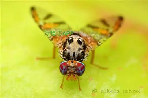 成虫:体长4.5~5.5mm,翅长4.5毫米,体和翅上有特殊颜色,头褐色,额黄色。雄虫具有奇异的银灰色匙形额附器。胸部背面黑色有光泽,镶以黄白色斑纹。翅透明,短而宽,有黄色、褐色和黑色的斑点,并有断续的带纹;中部的带纹延伸到前缘和后缘;外侧的带纹仅延伸到翅的外缘而不及前缘,翅的前缘和基部为深灰色。雄虫前足腿节上侧的毛黑色,雌虫的为黄色。腹部橙红色,有2条红褐色带纹。雌虫产卵器较短而扁平,伸长时可达1.2毫米。卵白色到淡黄色,有光泽,纺锤形,略弯曲,两端尖。长0.9~1.1毫米,宽0.2~0.25毫米。