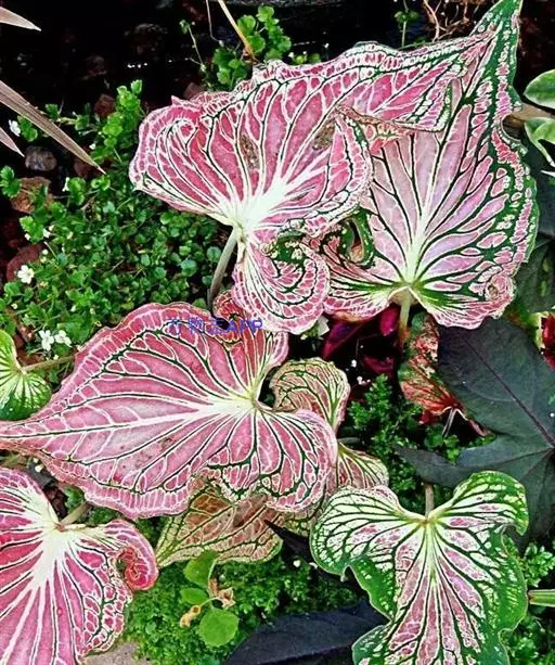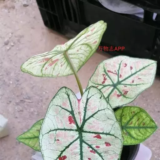 另外有小叶彩叶芋,叶小,卵圆心形,叶脉深绿色,叶面具乳白色不规则斑纹。