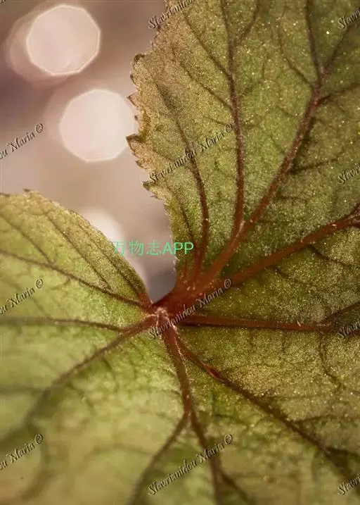 叶玫瑰红色,中心深紫红色,周围具白色斑纹,主脉红色。