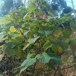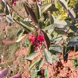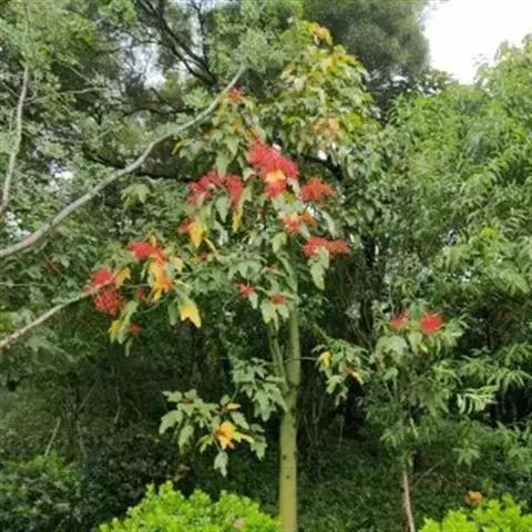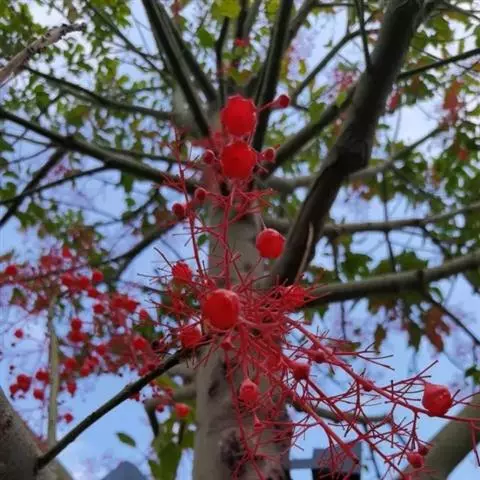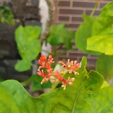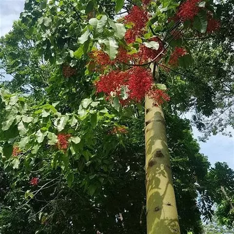 直立灌木,不分枝或少分枝,高0.3-1.5米,茎基部或下部通常膨大呈瓶状;枝条粗短, 北部湾广场瓶干树 肉质,具散生突起皮孔,叶痕大且明显。叶盾状着生,轮廓近圆形至阔椭圆形,长8-18厘米,宽6-16厘米,顶端圆钝,基部截形或钝圆,全缘或2-6浅裂,上面亮绿色,下面灰绿色,两面无毛;掌状脉6-8,其中上部3条直达叶缘;叶柄长8-16厘米,无毛;托叶分裂呈刺状,宿存。花序顶生,具长总梗,分枝短,红色,花萼长约2毫米,裂片近圆形,长约1毫米;花瓣倒卵状长圆形,长约6毫米,红色;雄花:雄蕊6-8枚,基部合生,花药与花丝近等长;雌花:子房无毛,花柱3枚,基部合生,顶端2裂。蒴果椭圆状,长13-18毫米,直径约15毫米,具3纵沟;种子长约1.1厘米,平滑。花期几全年。