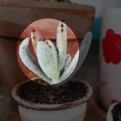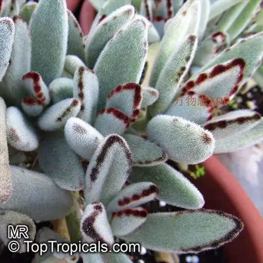 褐斑伽蓝植株被满绒毛,肉质叶片,形似兔耳。叶片边缘着生深褐色斑纹,酷似熊猫,故又有熊猫植物的美称。常用于盆栽观赏,用它装饰客室,乐趣无穷。