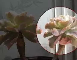 乙姬花笠,肉质叶倒卵形,较大,基部狭窄,叶缘淡红色,有波浪状起伏,叶色灰绿,被有白粉,在阳光较强的条件下叶面呈红色。