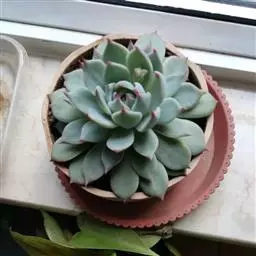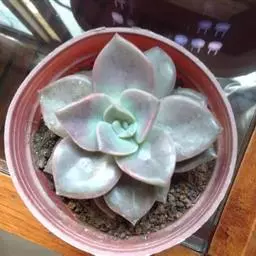 3.美丽莲又名“别露斯”,景天科风车草属植物,紧凑的莲座状叶盘灰绿褐色,被有白粉,花洋红色。