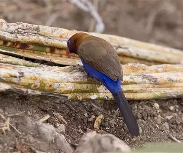 它的头部、喉部、背部及翅膀是深栗色,而 脸部、胸部、腹部 则为紫蓝色,雄鸟 甚至会出现到亮钴色。尾部很长 ( 大 约6.5公分长 )。喙部是粉红色。