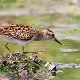 橙颊梅花雀体长约10厘米,头部灰色,两侧有大块橙色区域,嘴基及眼下方有黑纹,两条黑纹间呈白色,…