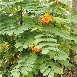 洋金凤 Sw.),豆科小凤花属灌木状或小乔木植物,枝无毛,绿或粉绿色;二回羽状复叶;总状花序伞房状,…
