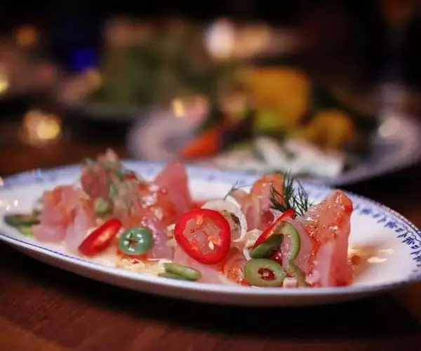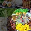 4、将各种色拉用蔬菜盛在盘子里,海鲜也盛好,样子要好看,然后用柠檬点缀,并淋上调味汁。