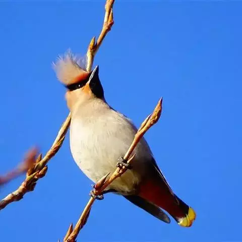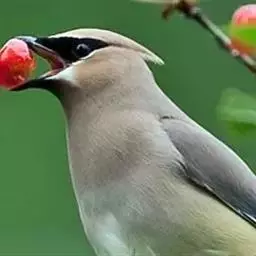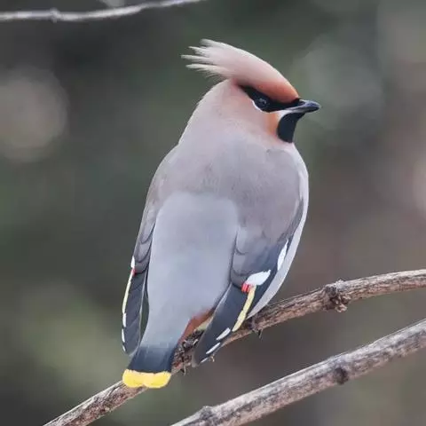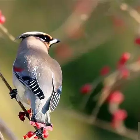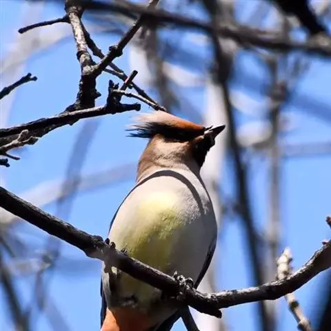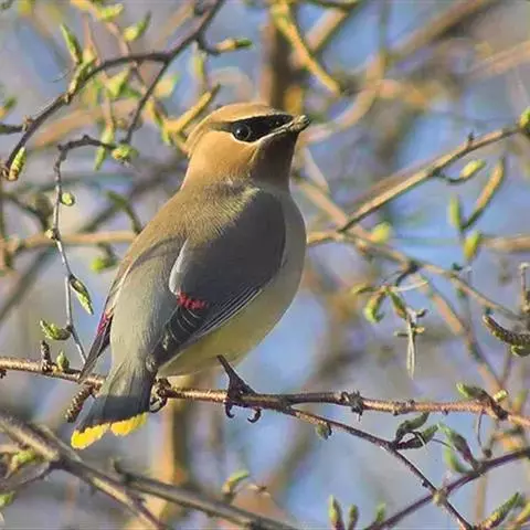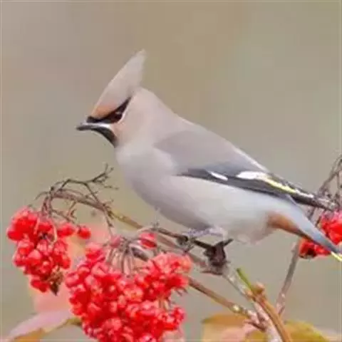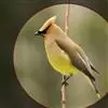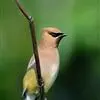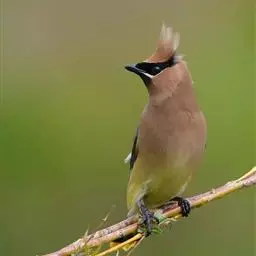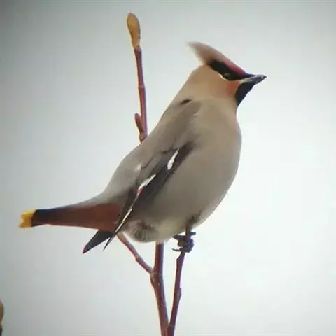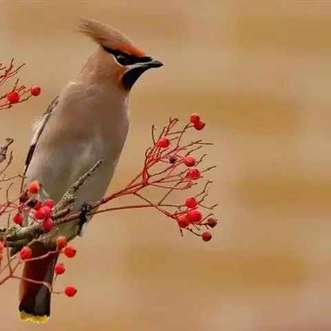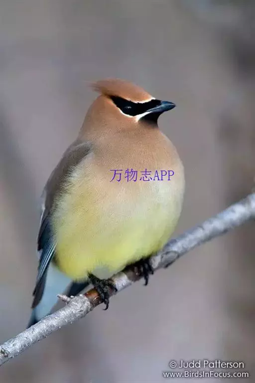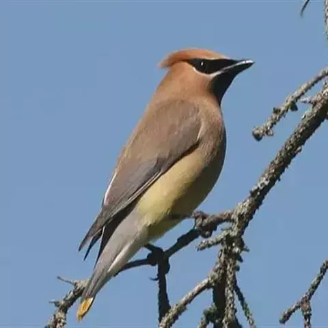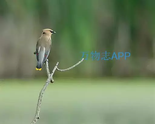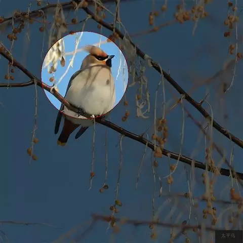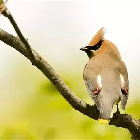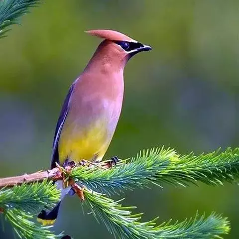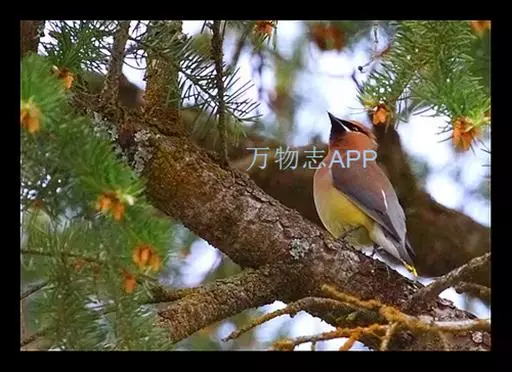 雪松太平鸟体形(学名Bombycilla cedrorum:)中等大小,体长约在19厘米左右。该物种雄雌同形同色,太平鸟成鸟额部及面部前端为栗色,向头后部颜色逐渐变浅;额基部、眼先、眼周及眼后部有黑色纹带,颌部亦有黑色区域;枕部黑色,与贯眼的黑色区域相链接,形成环绕头部的黑环;头顶具细长的簇状羽冠,这条羽冠常常覆盖在枕部的黑色羽区上,让人无法看到环绕头部的黑环;体羽松软,头部有一簇柔软的冠羽,嘴短,略呈钩状。喜群居,无领域性,多树栖,以松籽、浆果、昆虫为食。在美洲广泛分布。雪松太平鸟亚成鸟眼后和头枕部没有黑羽,前胸及腹部有明显的褐色带状纹。
