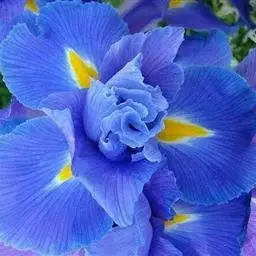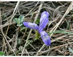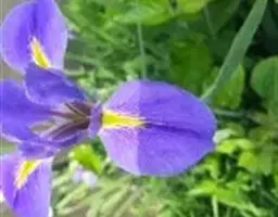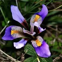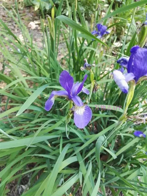 Iris sanguinea (学名:Iris sanguinea Donn ex Horn.):多年生草本。根状茎粗壮,斜伸,须根绳索状,灰白色,有皱缩的横纹。叶条形,中脉不明显。花茎光滑,实心,具1-2枚茎生叶;苞片3枚,膜质,绿色,披针形,内包含有2朵花;花天蓝色,直径6-7厘米;外花被裂片倒卵形,基部有黑褐色的网纹及黄色的斑纹,爪部楔形,内花被裂片直立,狭倒卵形。果实长卵状圆柱形,有6条明显的肋,成熟时自顶端向下开裂至1/3处。花期5-6月,果期7-9月。