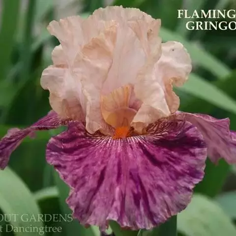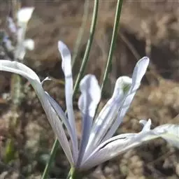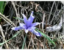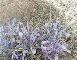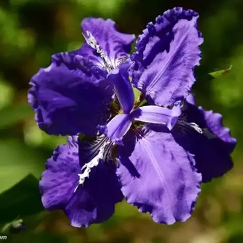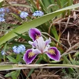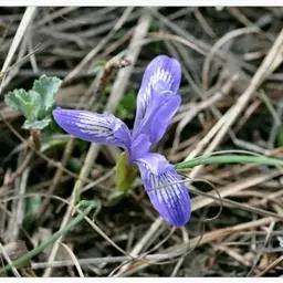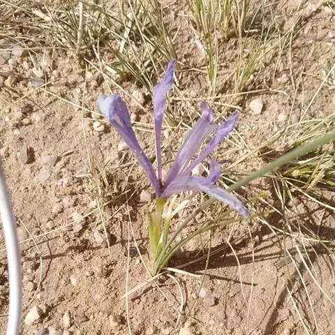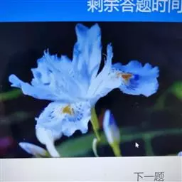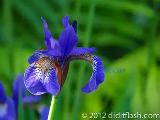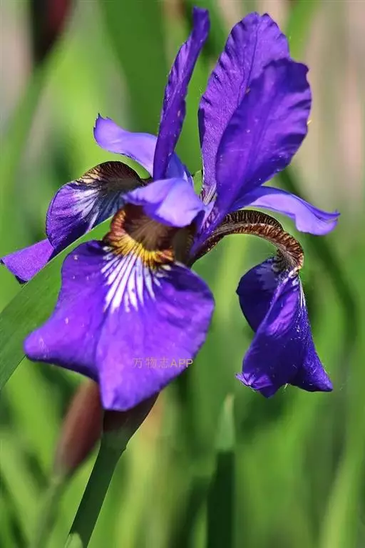 花茎高40-50厘米,实心,具1-2枚茎生叶;苞片3,披针形,长约7厘米,绿色,膜质,先端渐尖;花2-3朵,蓝色,直径6-7厘米,花被管长约1厘米,花被片6,2轮排列,外花被片倒卵形,长约5厘米,宽约1厘米,基部有黑褐色的网纹及黄色斑纹,爪部楔形,无附属物,内花被裂片3,狭倒卵形,长约4厘米,宽约1.5厘米;雄蕊长约3厘米,花丝白色,具黄色花药,花柱分枝扁平,花瓣状,长约3.5厘米,先端裂片三角形,有细齿;子房三棱状柱形。