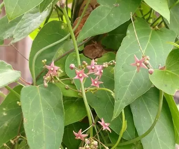 七层楼 多年生缠绕藤本,具乳汁;根须状,黄白色;全株无毛;茎纤细,分枝多。叶卵状披针形,长3-5厘米,宽1-2.5厘米,顶端渐尖或急尖,基部心形,叶面深绿色,叶背淡绿色,密被小乳头状凸起;侧脉每边3-5,叶背凸起,明显;叶柄纤细,长约5毫米。聚伞花序广展,腋生或腋外生,比叶为长;花序梗曲折,每一曲度生有1-2回伞房式花序;花淡紫红色,小,直径约2毫米;花萼裂片长圆状披针形,花萼内面基有5个腺体;花冠辐状,裂片卵形;副花冠裂片卵形,贴生于合蕊冠基部,钝头,顶端达花药的基部,花药菱状四方形,顶端有圆形膜片;花粉块每室1个,近球状,平展;子房无毛;柱头盘状五角形,顶端小凸起。蓇葖双生,叉开度180°-200°,线状披针形,长5厘米,直径4毫米,无毛;种子近卵形,棕褐色,无毛,顶端具白色绢质种毛;种毛长2厘米。花期5-9月,果期8-12月。