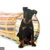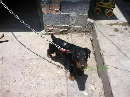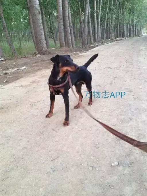 身材短小紧凑。头部伸长,吻端不尖,有点像楔形,吻部比颅部稍短。颅 德国猎梗犬 骨平坦,两耳间较宽阔,两眼间较狭窄。鼻子与吻部协调,不太窄也不太小,黑色,但披毛颜色是棕褐色的往往鼻子颜色也相同。脸颊丰满,上下颚有力,牙齿强健,剪状咬合。眼睛黑色,较小,卵形,神态坚定。耳朵耳根高,V形,向前折叠,属半直立耳。颈部健壮,不太长。背线直,背结实健壮。腰部肌肉良好。臀部肌肉丰满而平滑。胸部深,不太宽。肋部扩张良好。复线后收。尾巴断尾。肩部较长,肌肉发达。前肢直而平行,后肢骨量充足,肌肉发达。前足比后足宽,后足卵圆形。足趾紧凑,足垫厚而结实。披毛密实,硬而粗糙的毛或粗糙平滑的短毛。通常的毛色是黑色带褐色斑纹。身体毛色是黑色的,褐色一般限于足部、后臀、颊部、两眼上面、耳朵内侧、尾巴根部,颜色分布同多伯曼狗相似。其他可接受的毛色有黑褐色、褐色、棕色、红色和鼠灰色带斑纹。足趾和胸前可以有小块白色。