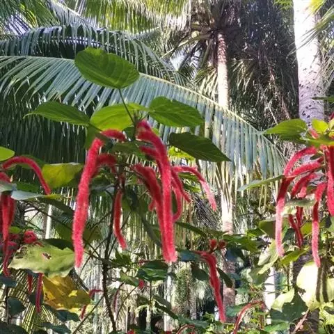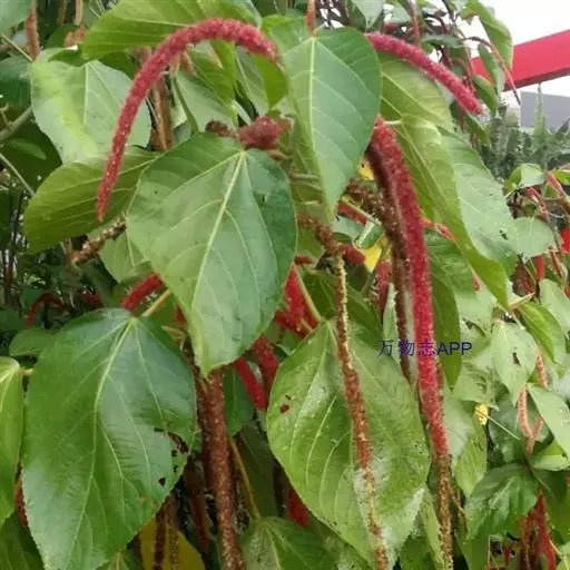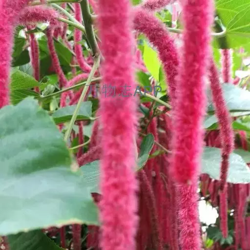 红穗铁苋菜(学名:Acalypha hispida Burm. F.):为大戟科、铁苋菜属植物,灌木,高0.5-3米。嫩枝被灰色短绒毛,毛逐渐脱落,小枝无毛。 花序色泽鲜艳,葇荑花序下垂,如狐狸尾状,雌花近卵形,长约0.8毫米,顶端急尖,具短毛;子房近球形,密生灰黄色粗毛,花柱3枚,红色或紫红色;花期2-11月。