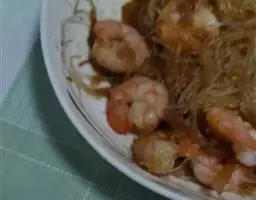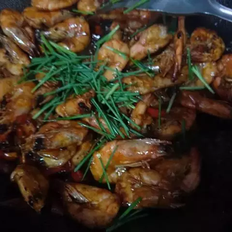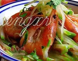材料:新鲜中虾约500克,蒜蓉2汤匙,红椒半只,葱粒1汤匙,香菜少许,老抽及生抽各1/2汤匙。