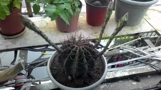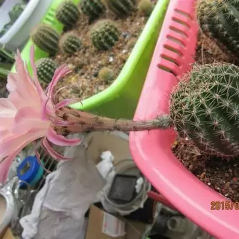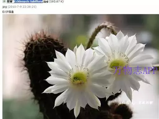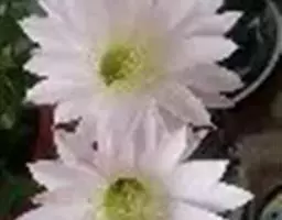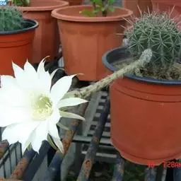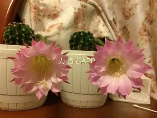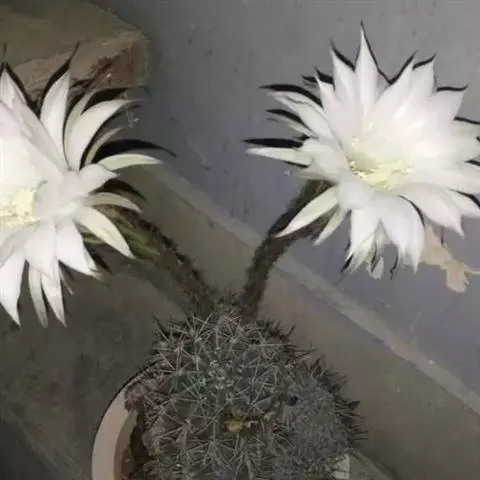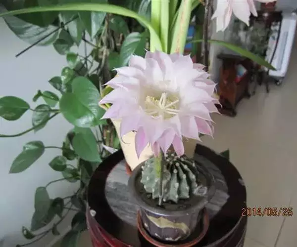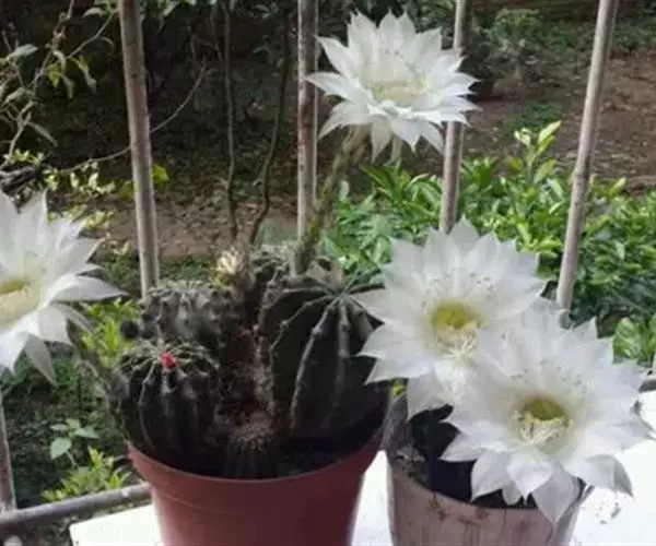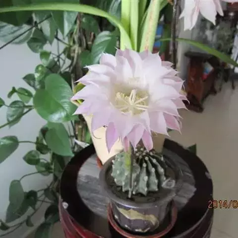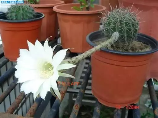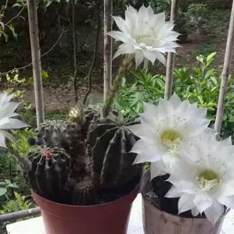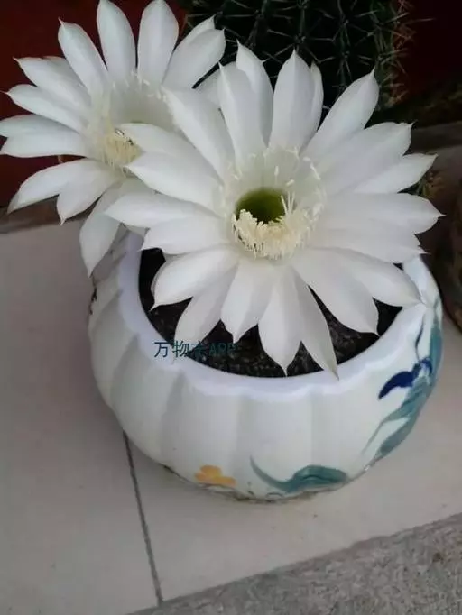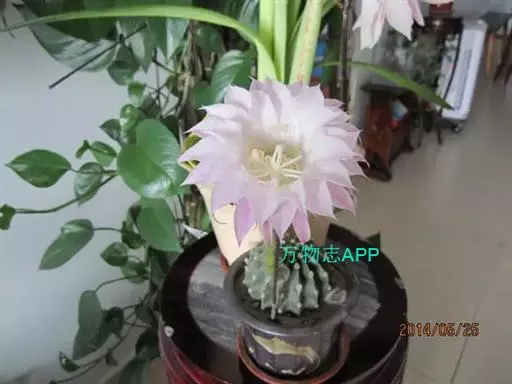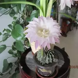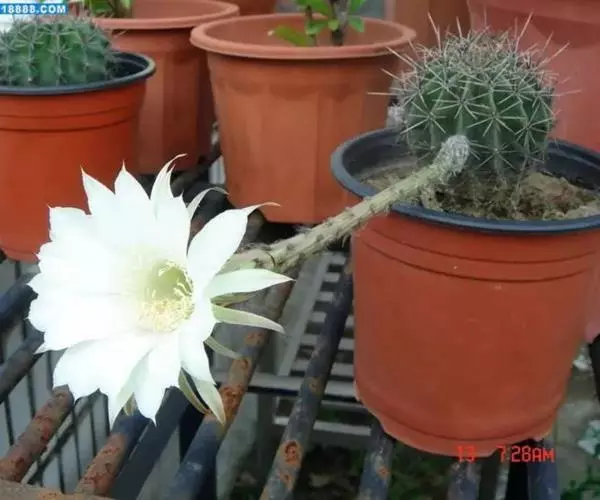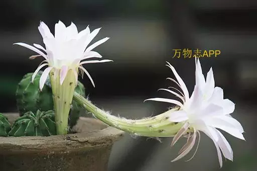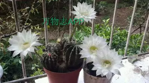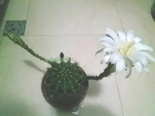 仙人球花(又名花盛球,花盛丸、草球花) 仙人掌科,仙人球属。植株单生或成丛。幼株球形,老株长成圆筒状,高可达75厘米,直径12-15厘米。球体暗绿色,具棱11-12。刺锥状,黑色,长1-1.5厘米。花着生于球体侧方,大型嗽喇叭状,白色。夏季开花。傍晚后开放,翌日清晨即凋谢。原产阿根廷北部及巴西南部的干旱草原,阳光充足,但有草丛遮荫。夏季雨水充沛而冬季干燥。植株强健,喜阳光充足,较耐寒。幼株球形,老株圆筒状,顶端凹入,高约75厘米,径12~15厘米。主球茎基盘萌发籽球。球体暗绿色,具12-14个脊高的棱,棱规则呈波状。棱上刺点单行整齐排列,刺锥状、黑色或茶色,周刺10~15,中刺2~7,稍长,新刺黑褐色,老刺黄褐色。花着生于球体侧方,大型嗽喇叭状,白色(或黄色),具香气,长约24厘米,径约l0厘米,夏季开花。傍晚后开放,翌日清晨即凋谢。一般单花开放时间36小时。是大众化的室内盆花,也是嫁接仙人掌类球形品种的良好砧木。