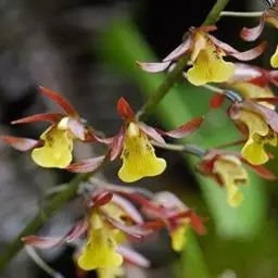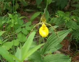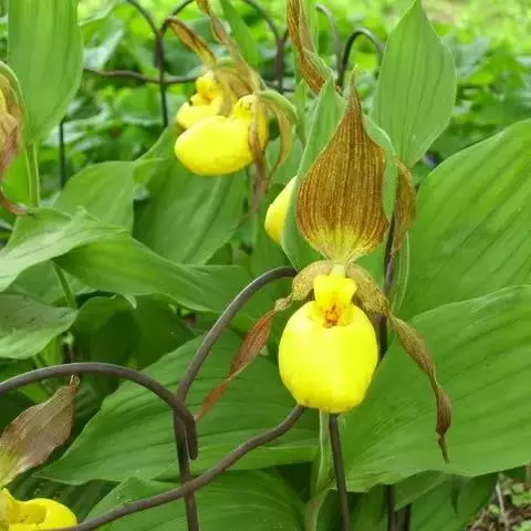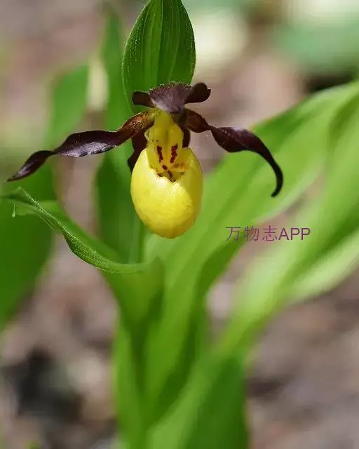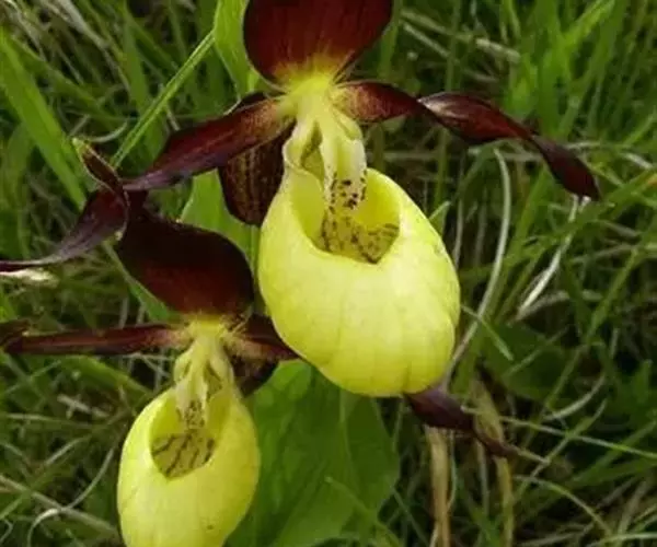 杓兰(学名:Cypripedium calceolus L.):植株高20-45厘米,具较粗壮的根状茎。茎直立,被腺毛,基部具数枚鞘,近中部以上具3-4枚叶。叶片椭圆形或卵状椭圆形,较少卵状披针形。花序顶生,通常具1-2花;花具栗色或紫红色萼片和花瓣,但唇瓣黄色;花瓣线形或线状披针形,长3-5厘米,宽4-6毫米,扭转,内表面基部与背面脉上被短柔毛;唇瓣深囊状,椭圆形。花期6-7月。