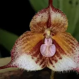 花序顶生,通常具1-2花;花苞片叶状,椭圆状披针形或卵状披针形,长4-6(-10)厘米,宽1.5-4厘米;花梗和子房长约3厘米,具短腺毛;花具栗色或紫红色萼片和花瓣,但唇瓣黄色;中萼片卵形或卵状披针形,长2.5-5厘米,宽8-15毫米,先端渐尖或尾状渐尖,背面中脉疏被短柔毛;合萼片与中萼片相似,先端2浅裂。
