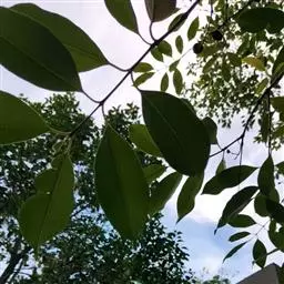 叶互生,叶片革质,披针形或狭长圆形,长4-10厘米,宽1-2厘米,两端尖,基出脉3-5(-7)条,多油腺点,香气浓郁;叶柄极短。