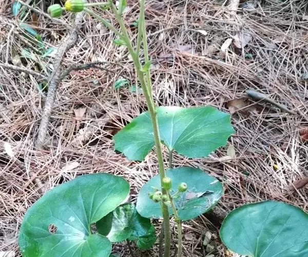 多年生葶状草本。根茎粗壮,直径达1.2厘米。花葶高达70厘米,幼时被密的淡黄色柔毛,后多少脱毛,基部直径5-6毫米,被极密的柔毛。叶全部基生,莲座状,有长柄,柄长15-25厘米,幼时被与花葶上一样的毛,后多脱毛,基部扩大,呈短鞘,抱茎,鞘内被密毛,叶片肾形,长9-13厘米,宽11-22厘米,先端圆形,全缘或有小齿至掌状浅裂,基部弯缺宽,长为叶片的1/3,叶质厚,近革质,两面幼时被灰色柔毛,后脱毛,上面绿色,下面淡绿色;茎生叶1-3,苞叶状,长圆形或线状披针形,长1-2厘米。
