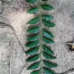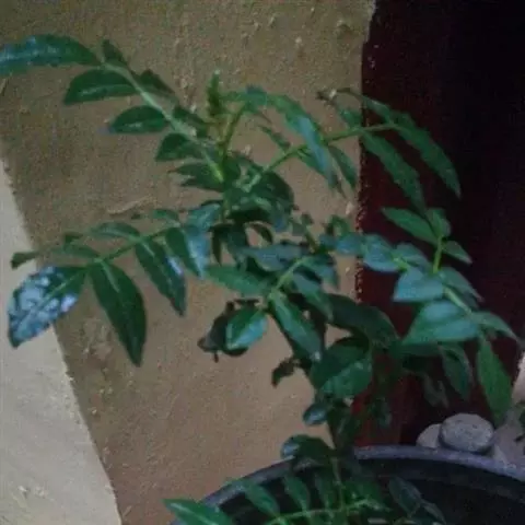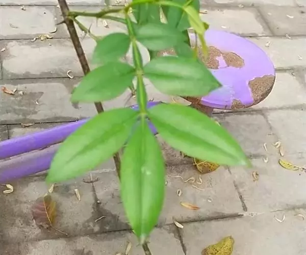 叶有小叶5-13片,叶轴常有甚狭窄的叶翼;小叶对生,无柄,卵形,椭圆形,稀披针形,位于叶轴顶部的较大,近基部的有时圆形,长2-7厘米,宽1-3.5厘米,叶缘有细裂齿,齿缝有油点。其余无或散生肉眼可见的油点,叶背基部中脉两侧有丛毛或小叶两面均被柔毛,中脉在叶面微凹陷,叶背干后常有红褐色斑纹。