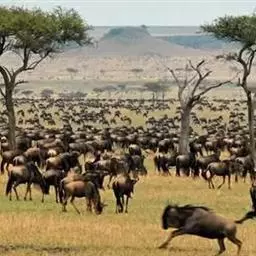 六个月的旱季过去了,雨季却姗姗来迟。令人渴望的暴风雨遥在远方。母跳羚把产期拖了拖,但再也不能耽搁了,它们纷纷开始产仔。即使捕食者就在周围,母羊们也依然镇定自若,产仔过程中它们甚至还在吃草,许多母羊都是边走边生。由于所有的小羊羔几乎都在同一星期和同一地点出生,这就给捕食者提供了超过自己食量的食物,因此,许多小羊羔都活了下来。胞衣的气味可能会暴露小羊羔,于是母羊把它吃掉。