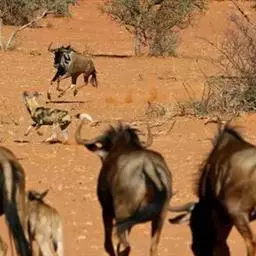 豺狗是最大的威胁,它们紧盯着每一只母羊。对跳羚来说,万幸的是捕食者都喜欢待在自已的领地上,而且数量不多。在正午的阳光下出生,生命会更有保障,因为大多数捕食者此刻正在树荫下乘凉。母羊从小羊羔身边走开,迫使它站起来跟上。这几分钟对小羊羔来说关系重大,它必须让自己的腿听从指挥。鬣狗平时只在夜间活动,但在跳羚产仔期间,它增加了白天的外出巡视。小羊羔身上的气味不大,这条过路的鬣狗没有闻到也没发现什么。十分钟后,羊羔们跟着妈妈走到遮蔽物更多的沙丘地带。匡也来了,为了找到更好的食物,它离开了自已的领地。其它母羊也带来了自已的孩子。这里不久就变成了一个托儿所——一个母羊外出吃草时,小羊羔能够隐藏起来的育婴点。