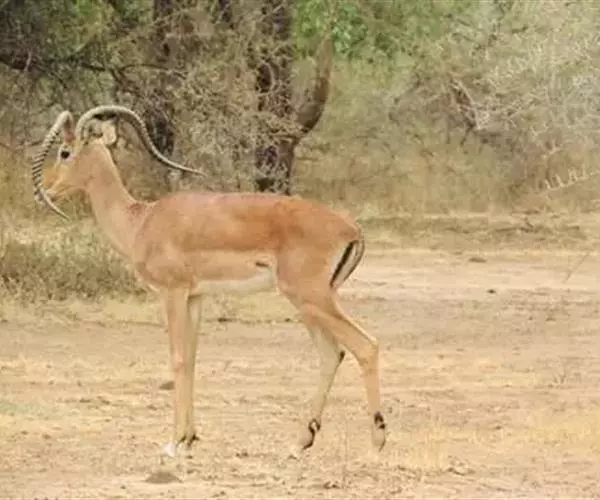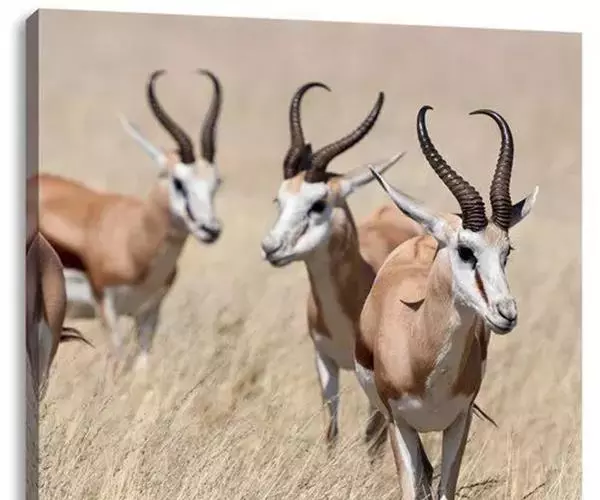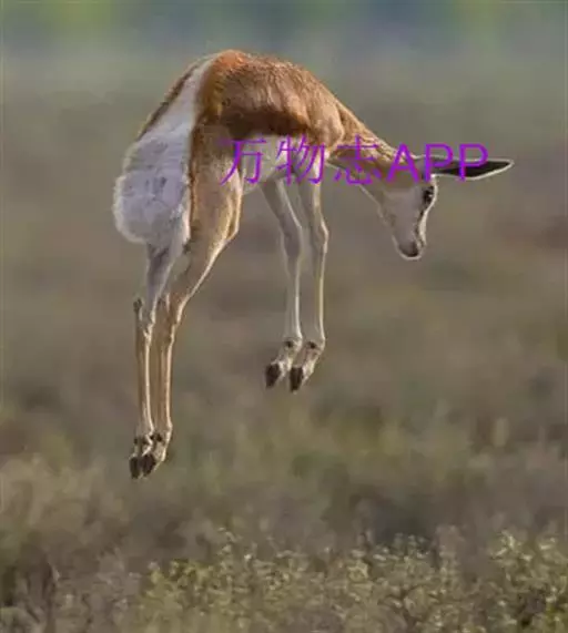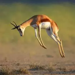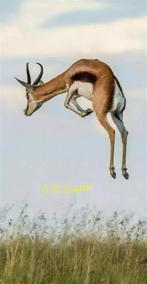 跳羚(学名:Antidorcas marsupialis):体长1.2-1.5米,肩高68-90厘米,体重37-50千克;四肢细长;背部中央有1条纵向的由皮肤下凹而形成的褶皱,褶皱内的毛为白色,当受惊而开始逃跑时,褶皱展开,出现1条明显的白脊,这是向同伴告警的信号;雌雄均具角,黑色上具环棱。极善跳跃,跳起时脊背弓起,四肢下伸而靠拢,一跃可高达3-3.5米,故名。