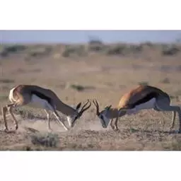 这只公羊不是“匡”的邻居,它是一个入侵者。“匡”的利益受到威胁。它聚集的母羊乃至它的生命都可能在一瞬间输给这个挑战者。一般说来,跳羚之间角斗是短暂而危险 的,没有什么仪式。它们的角也许会卡在一起,眼珠也许会被挑出,身体也许会被刺穿——这些交锋都可能致命。败阵的一方只有退入到单身公羊群中。经常性的应 战使“匡”的精力逐渐消耗,它的体重会在两星期内减轻百分之十。