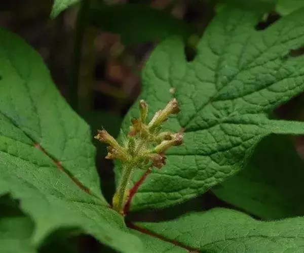 图版24: 4-6 叶羽状深裂,基部楔形至宽楔形,近无柄,轮廓倒卵形至倒卵状椭圆形,长8-20厘米,宽6-18厘米,裂片1-3对,无锯齿,顶端渐尖,上面浅绿色,散生刚毛,沿脉及边缘毛较密,背面黄白色;茎基部的初生叶有时不分裂。聚伞花序对生,各具3朵花,无总花梗,有时花序下具卵全缘的苞片,在茎或分枝顶端集合成短穗状花序;萼筒被刚毛和腺毛,萼裂片三角形,长3毫米;花冠黄绿色,狭钟状,长1厘米,筒基部弯曲,一侧膨大成浅囊,被腺毛,裂片圆而短,内面有带紫色斑点;雄蕊着生于花冠筒中部以下,花丝短,花药矩圆形,花柱基部被长柔毛,柱头楔状头形。果癸卵圆,肉质,具3条槽,长10毫米,冠以宿存的萼齿;核3枚,扁,亮黑色。种子凸平,腹面具2条槽。花期5-6月,果期8-9月。