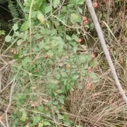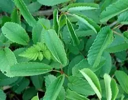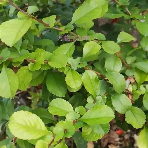 矮灌木,高约1米,枝条广开,有细刺;小枝粗糙,圆柱形,幼时具绒毛,紫红色,二年生枝条有疣状突起,黑褐色,无毛;冬芽三角卵形,先端急尖,无毛,紫褐色。叶片倒卵形、匙形至宽卵形,长3-5厘米,宽2-3厘米,先端圆钝,稀微有急尖,基部楔形或宽楔形,边缘有圆钝锯齿,齿尖向内合拢,无毛;叶柄长约5毫米,无毛;托叶肾形有圆齿,长1厘米,宽1.5-2厘米。