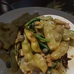 2.青红椒切成三角片、木耳撕成片。