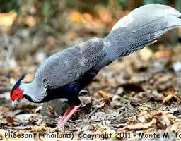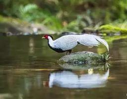 白颈长尾雉:大型鸡类,体长81厘米,体型大小和雉鸡相似。雄鸟头灰褐色,颈白色,脸鲜红色,其上后缘有…