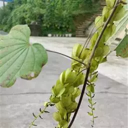 块茎 草质缠绕藤本;根状茎横生,栓皮显著片状剥离。茎左旋,近无毛。单叶互生,掌状心脏形,边比值作不等大的三角状浅裂、中裂或裂,顶端叶片近于全缘。花雌雄异株;雄花无梗,荭部花常2-4朵簇生,顶端通常单一,花被碟形,顶端6裂;雄蕊6;雌花序穗状,常单生。蒴果翅长1.5-2厘米,宽0.6-1.0厘米;种子每室2枚,生于每室的基部,四周有不等宽的薄膜状翅,上方呈长方形,长约2倍于宽。